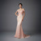 Elegant formal evening dress in a fitted silhouette, accented with lace and beadings on the bodice.